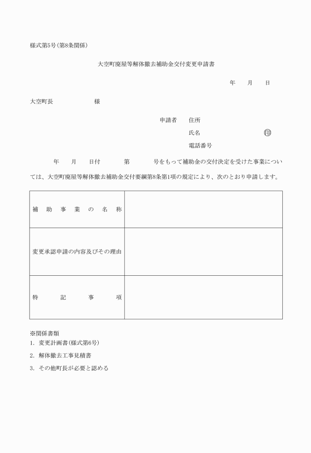 第1条 この告示は、町内の景観の向上及び住民の安心で安全な住環境の確保を図るために、町内に存在する廃屋等を解体及び撤去した場合にその費用の一部を予算の範囲内で補助することについて、大空町補助金交付規則に定めるもののほか、必要な事項を定めるものとする。